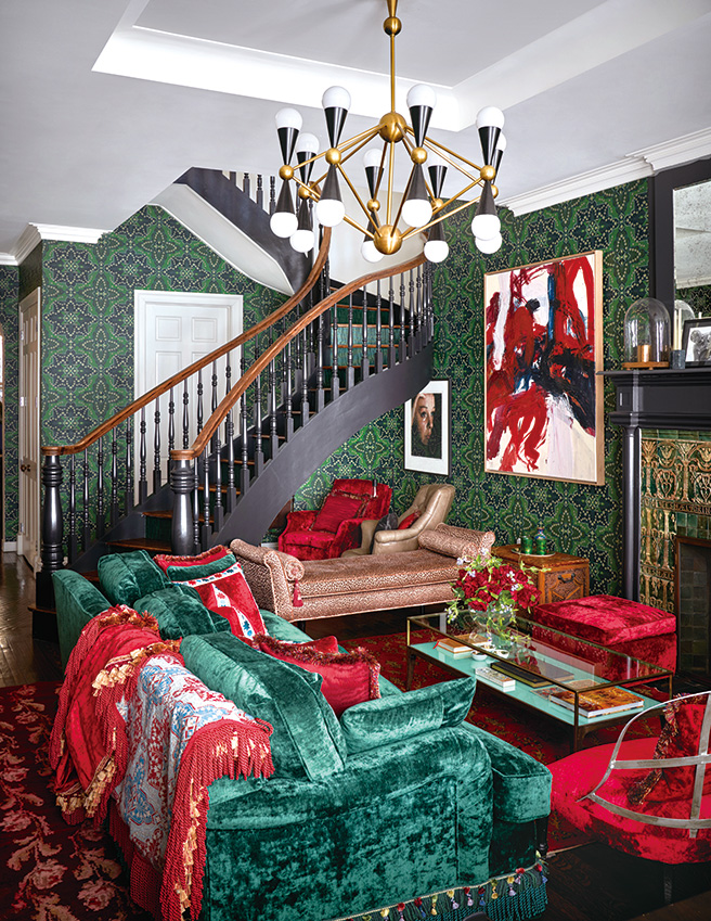 1층의 그린 룸. 소파는 Restoration Hardware. 암 체어와 빈티지 셰이즈 의자, 주문 제작한 오토만 의자, 쿠션에 씌운 패브릭은 모두 Catherine Martin for Mokum. 가죽 의자는 Anthropologie. 커피 테이블은 Tracey Boyd. 샹들리에는 Jonathan Adler.