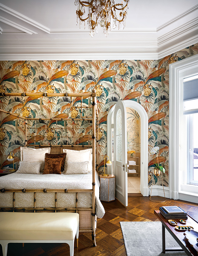 침실에 놓인 침대는 Tracey Boyd. 침대 머리맡 양쪽의 램프는 Rejuvenation. 화분은 Anthropologie. 벽지와 베드 스프레드, 쿠션은 모두 Catherine Martin for Mokum.