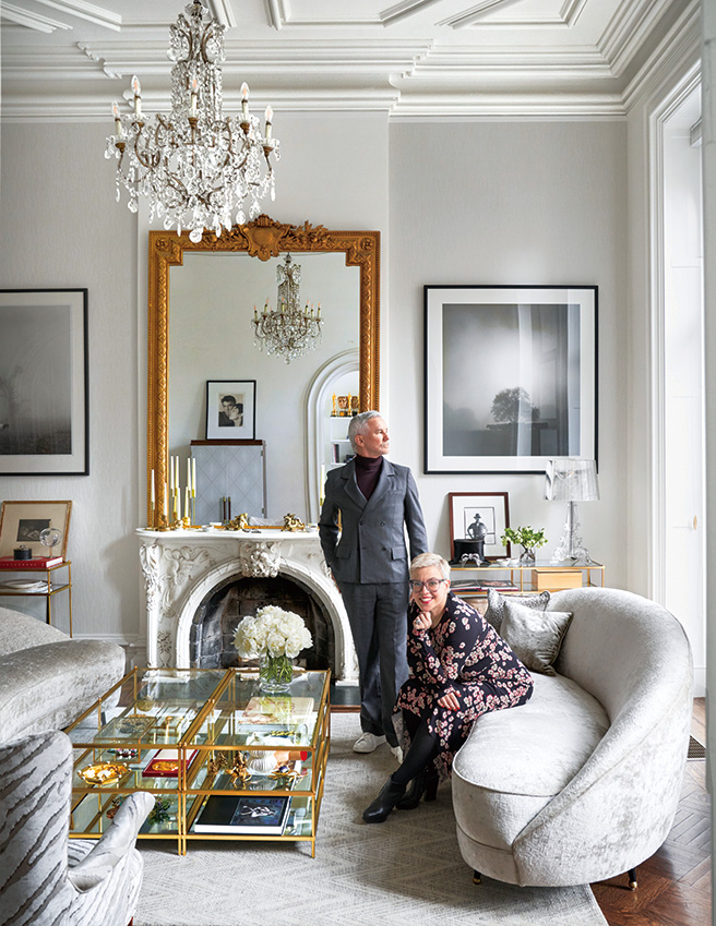 2층 화이트 룸에서 고샤 루브친스키 수트를 입고 프라다 스니커즈를 신은 바즈 루어만과 이자벨 마랑 원피스에 바네사브루노 부츠를 신은 캐서린 마틴. 샹들리에는 부부가 이사 오기 전부터 있었던 것을 그대로 살렸고, 웨스트 엘름에서 구입한 곡선형 소파에는 텍스타일 브랜드 모컴과 협업한 마틴의 컬렉션 패브릭을 씌웠다. 벽에 걸린 사진 중 오른쪽은 포토그래퍼 렉스 두페인의 작품.