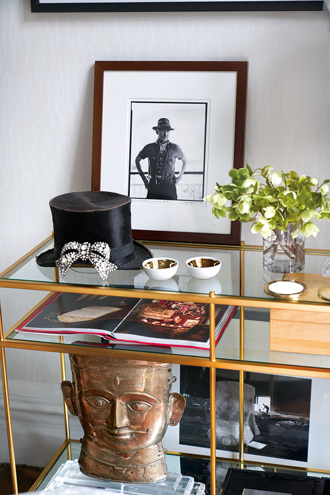 영화 <물랑루즈> 촬영장에서 가져온 실크 햇, 더글러스 커크랜드의 사진, 인도에서 구입한 앤티크 조각상이 웨스트엘름 콘솔에 진열돼 있다