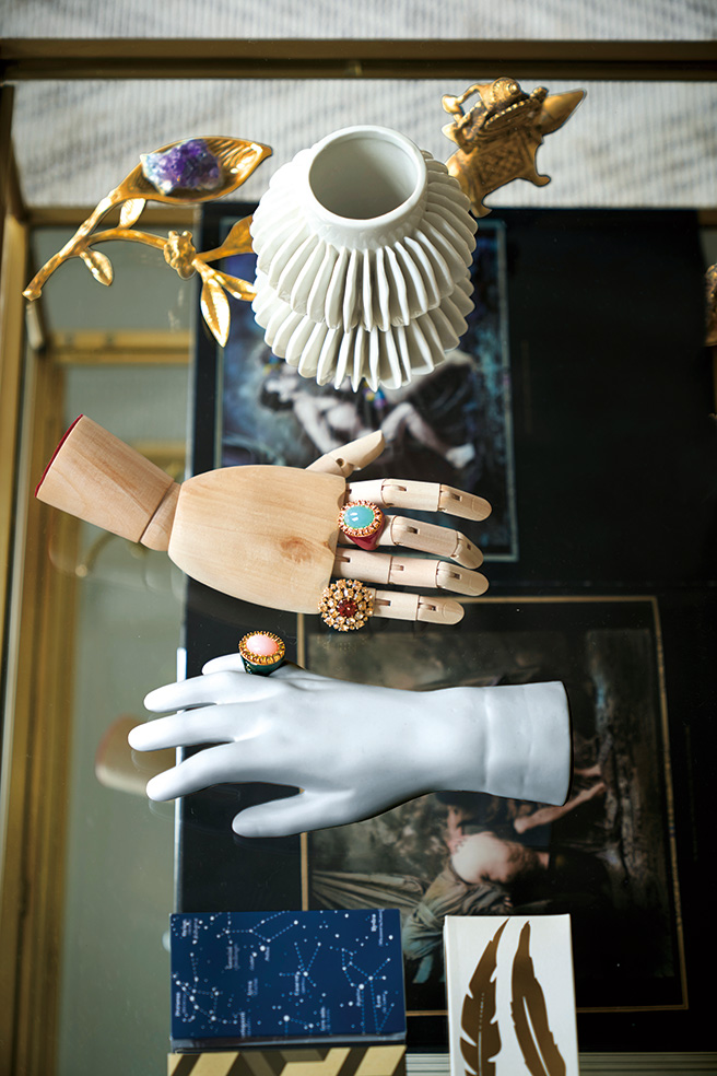 커피 테이블 안에 가지런히 놓인 손 모양의 조각품과 성냥갑은 Jayson Home. 꽃병은 CB2.