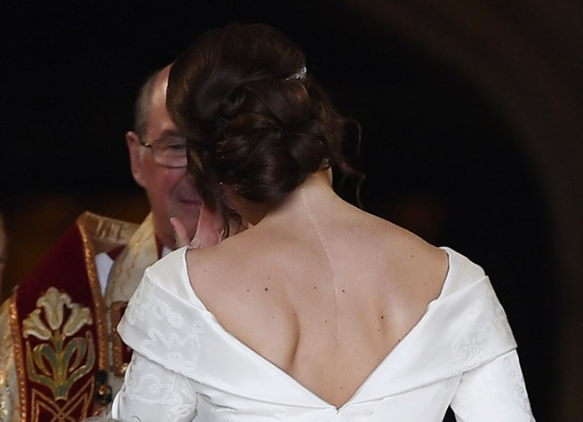 “어린 시절 척추측만증을 고치기 위해 절 도와준 분들에게 감사의 마음을 전하고 싶었습니다. 또 같은 병으로 고생하는 모든 분들께 용기를 불어넣어 드리기 위해, 이와 같은 드레스를 디자이너들에게 특별히 부탁했습니다.” 즉 유지니 공주의 요청에 따라 디자이너들은 상처가 잘 보이도록 낮은 백 라인의 드레스를 제작한 것. 또한 이번 결혼식에서 파격적으로 베일을 착용하지 않은 이유도 이 때문이라는 후문이다.