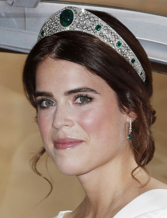 유지니 공주의 모습을 한층 아름답게 만들어준 웨딩 주얼리는? 1919년 만들어진 할머니인 엘리자베스 여왕 2세의 티아라와 다이아몬드와 에메랄드로 장식된 이어링이다. 이는 서양 결혼 문화 중 신부가 지녀야 하는 준비물 중 ‘Something Old(오래된 것)’에 완벽하게 부합하는 아이템!
