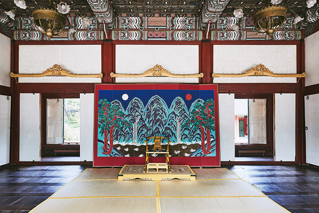 세 번째 해에는 양쪽 온돌방 사이의 대청마루 공간에 왕실의 품격을 상징하는 용교의, 용문석, 오봉병을 놓았다. 용교의는 왕이 앉던 접이식 의자, 용문석은 용교의를 약간 높게 받쳐주는 단, 오봉병은 왕의 뒷모습을 가려주는 거대한 사이즈의 병풍이다. <고종실록>에는 이런 문구가 나온다. ‘함녕전에 나가 러시아의 전 공사 마튜닌과 새로 임명된 공사 파블로프를 접견하였다.’ 고종이 집무를 보기도 했던 공간은 지금 눈앞에 보이는 모습 그대로였을 것이다. 이렇게 3년간 총 10명의 장인이 10개 정도의 오브제를 완성해 함녕전 복원이 끝났다.