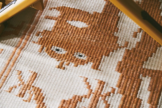 가마솥에서 치자와 함께 삶은 왕골 껍질을 얇게 저며 노란색으로 물들인 다음 이것을 바늘에 끼워 돗자리에 무늬를 넣는 방식으로 제작한 용문석.