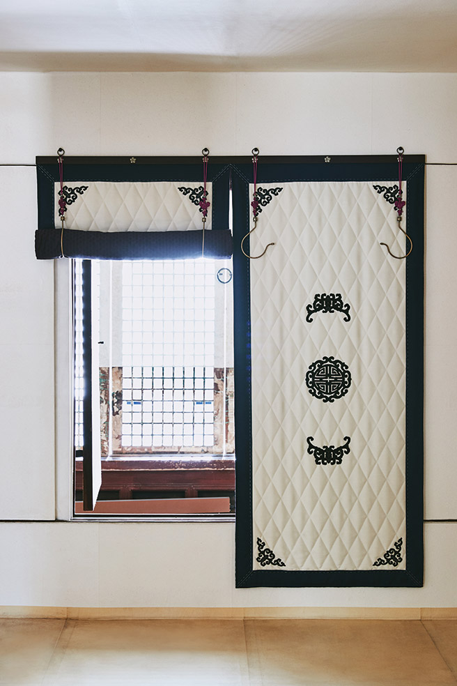왕비의 방에 걸린 무렴자는 서쪽을 상징하는 백색 바탕에 왕비의 기품을 담은 쪽빛을 배합했다.