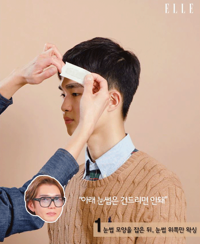 눈썹 모양자(시판 제품)를 대고 눈썹 모양 틀을 그려준다. 눈썹 아래부분은 그대로 둔 채 눈썹 윗 부분만 깔끔하게 왁싱해주기. 아래 눈썹은 건드리면 다시 다듬기 어렵고 가끔은 꼴불견처럼 어색한 눈썹을 만드는 일등 공신이라고 하니 기억할 것! 눈썹 윗 부분만 깔끔하게 다듬어도 인상이 깨끗해 보인다.