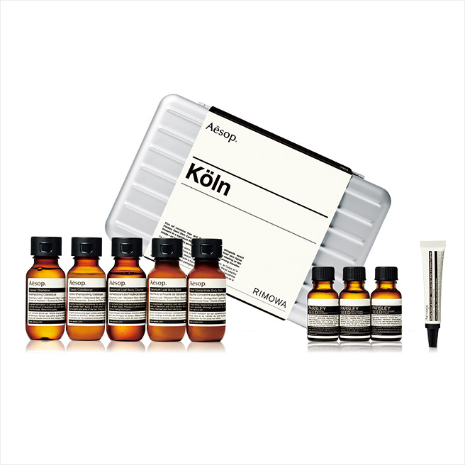 시가를 담는 리모와 여행용 휴미더에서 영감 받아 내구성을 높인 케이스에 담았다. 클래식 샴푸와 컨디셔너, 제라늄 보디 클렌저와 보디 밤, 파슬리 시드 스킨케어 등 9종의 제품으로 구성. 쾰른 트래블 키트, 55만1천원, Aesop.