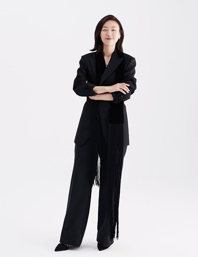 재킷과 팬츠는 모두 kimseoryong. 프린지 스카프는 & other stories. 네크리스와 이어링은 모두 beauton.