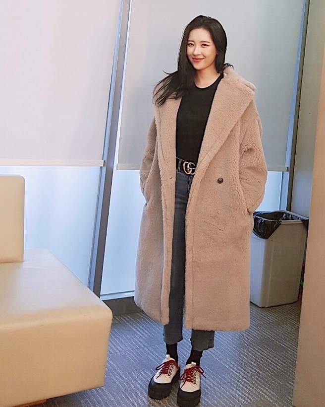 큼직한 시어링 퍼 코트가 부담스럽다면? 한예슬처럼 한쪽 어깨를 살짝 내려 몸매의 라인을 드러내는 것도 하나의 방법이 될 수 있다.