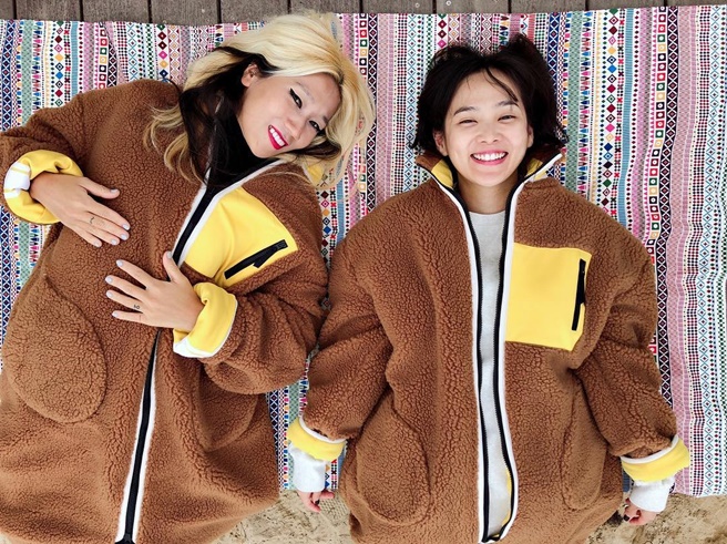 윤승아의 귀여운 퍼 코트에 주목! 테디 베어 코트라고 늘 같은 디자인일 필요는 없으니까. 시어링 퍼 소재를 옐로 포켓과 안감, 지퍼를 활용해 스포티하게 재해석한 SJYP의 아우터를 선택한 그녀. 독특한 디자인 탓에 별다른 액세서리가 필요 없다.