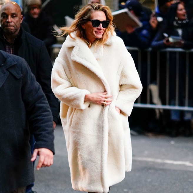줄리아 로버츠가 착용한 화이트 컬러의 테디 베어 코트는 어떤가. 온몸을 포근하게 감싸는 큼직한 아우터가 피부 톤을 환하게 밝혀준다.