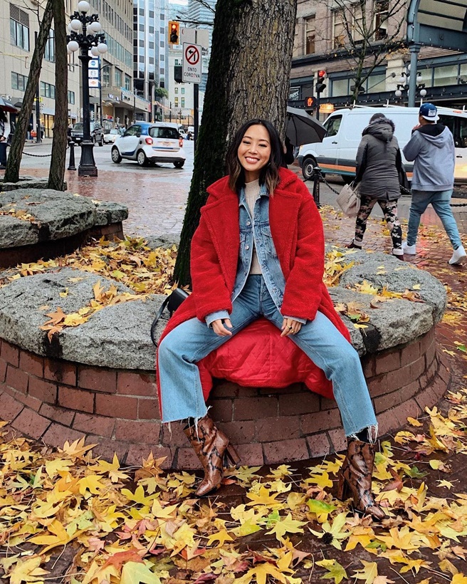 브라운 컬러가 지겹다면 레드 컬러의 테디 베어 코트를 눈여겨보자. 패션 아이콘답게 데님 재킷과 팬츠를 활용해 청청 패션 위에 아우터를 매치한 아미 송.