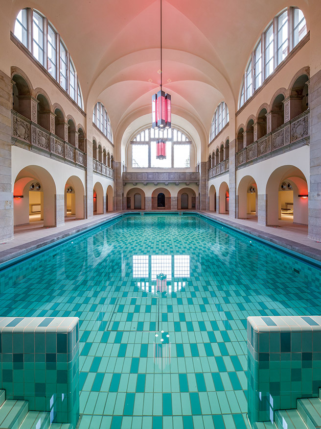 공공 수영장 건물을 개조한 호텔 오더베르거의 상징, 커다란 수영장.