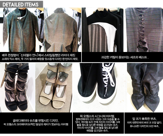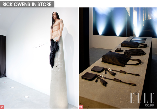 1 숍을 들어서자 마자 자리잡고 있는 릭오웬스의 밀랍인형. 릭오웬스의 밀랍인형은 원래 파리에 위치한 그의 집에 자신을 상징화하기 위해 세웠다고 한다. 하지만 시간이 지나면서 항상 집에서 그 자신을 보는 것에 싫증을 느끼게 되었고 밀랍인형이 그의 집보다 파리 스토어에 놓였을 때, 왜곡되지만 보다 강렬한 이미지를 부여해 줄 것이라 예상. 결국 스토어에 세워졌다고. 이는 릭 오웬스의 열정과 헌신을 보여주면서 스토어에 그의 존재감을 강하게 부각. 현재까지 하나의 전통으로 자신을 형상화한 밀랍인형을 스토어에 세우고 있다.