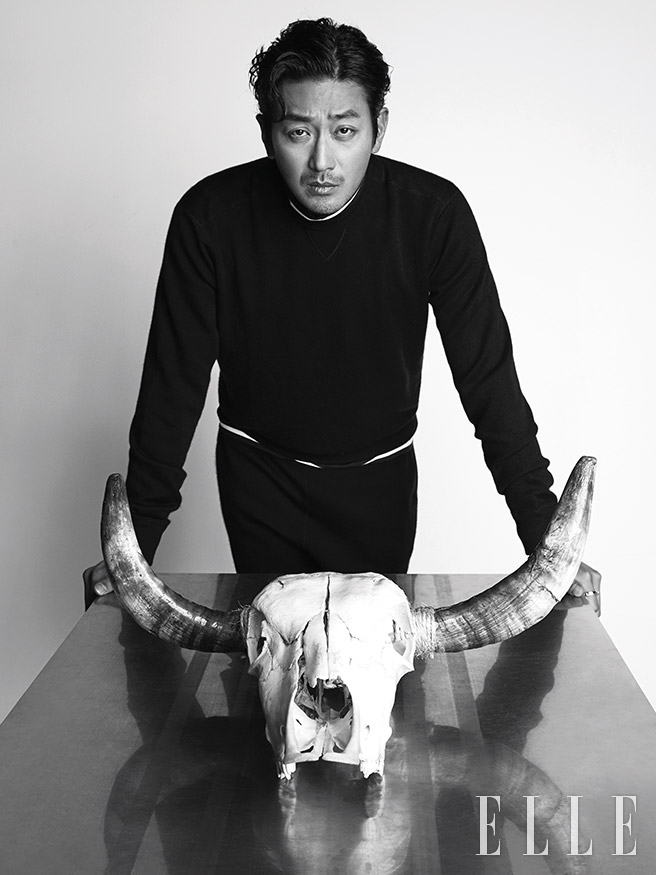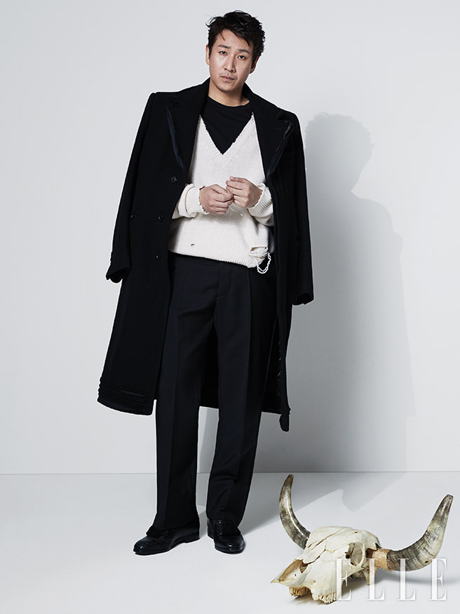 하정우가 입은 모던한 터틀넥 니트 스웨터와 벨트 포인트의 팬츠는 Wooyoungmi. 슈즈는 Salvatore Ferragamo.