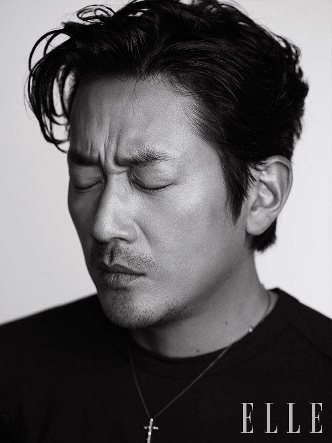 하정우가 입은 베이식 티셔츠는 Comme des Garcons. 팬츠는 Songzio Homme. 레이스업 슈즈는 Tod’s. 펜던트 목걸이와 팔찌는 Damiani. 반지는 Ille Lan.