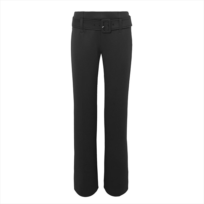 우아한 분위기를 자아내는 벨티드 디자인의 로우라이즈 팬츠는 Prada.