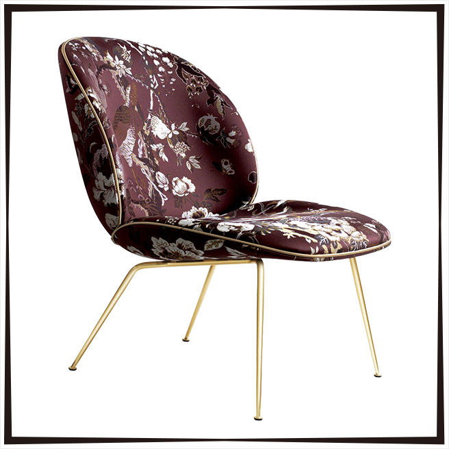 감프라테시가 디자인한 ‘더 비틀 체어’의 화려한 프린트를 씌운 라운지 체어는 Gubi.