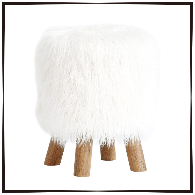 몽골리언 인조 퍼로 만든 화이트 컬러 스툴은 Pottery Barn.