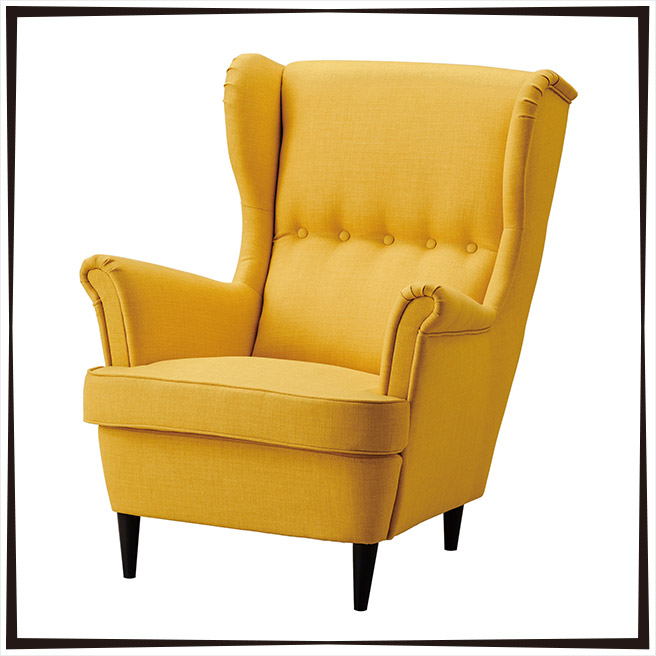 50년대에 처음으로 선보인 디자인을 리에디션했다. 시프테보 옐로 컬러 커버를 씌운 ‘스트란드몬 윙체어’는 Ikea.
