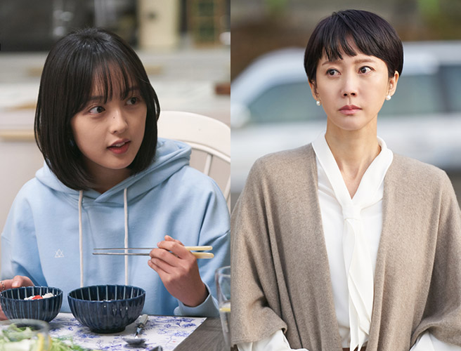 한없이 차가운 김주형 선생님 역할의 김서형과 반대로 따뜻한 매력의 우주 엄마, 이태란은 의외로 비슷한 뷰티 룩을 선보이고 있다. 공통점은 또렷한 아이라인과 반듯한 일자 눈썹! 같은 메이크업이지만 전혀 다른 느낌으로 연상 되는 이유는 두 가지, 컬러와 눈꼬리 라인이다. 김서형은 눈썹의 경우 김주형 선생님의 카리스마를 표현하기 위해 짙고 어두운 컬러로 눈썹을 꽉 메워 그렸으나 이태란은 헤어 컬러보다 옅은 컬러로 가볍게 채워준 것이 특징. 아이라인 역시 눈꼬리를 올려 그린 김서형에 반해 이태란은 끝을 내려 선한 인상을 만들었다.