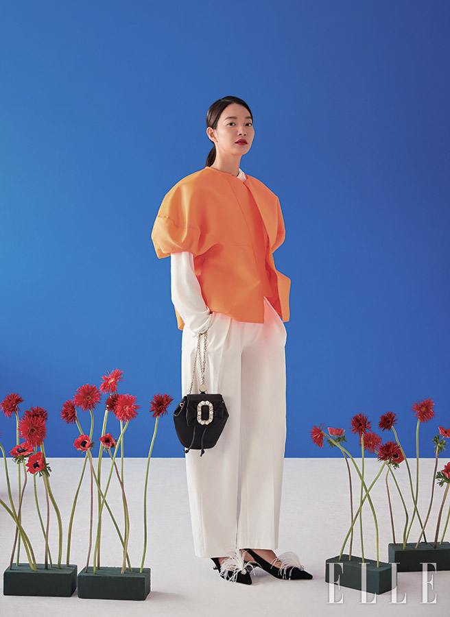 크리스털과 진주로 장식된 버클이 화려함을 더해주는 새틴 미니 백, 드라마틱한 깃털 장식의 슈즈는 모두 Roger Vivier. 상큼한 오렌지 컬러 톱은 Sofie D’hoore by 10 Corso Como Seoul. 플리츠 블라우스와 팬츠는 모두 EENK.