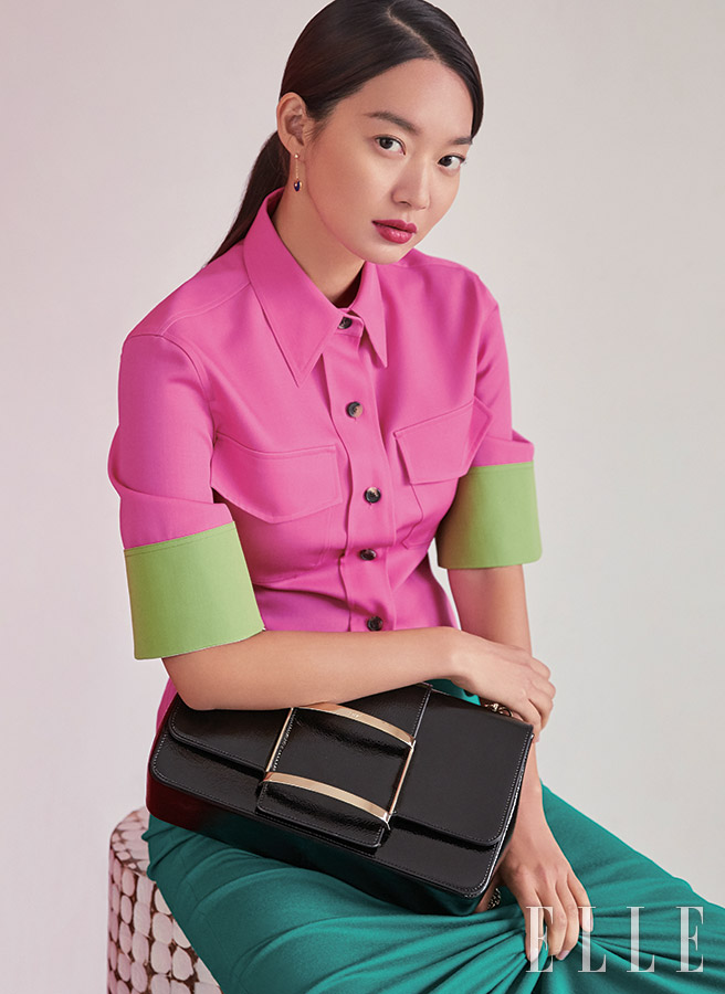 각진 형태와 커다란 버클의 조합이 모던한 숄더백은 Roger Vivier. 비비드한 컬러 블로킹의 셔츠와 니트 스커트는 모두 Calvin Klein 205W39NYC by 10 Corso Como Seoul. 귀고리는 Cartier.