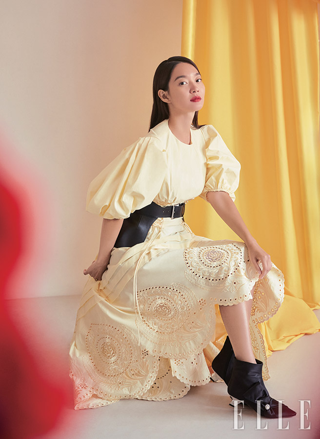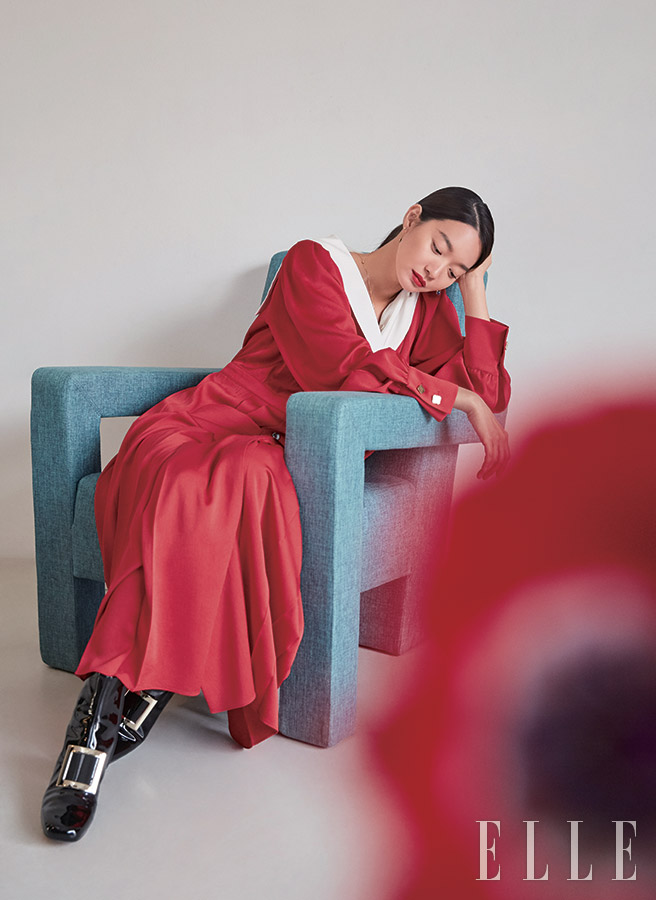 <엘르>와 두 번째 커버 작업이에요. 매거진을 비롯해 패션계의 러브 콜이 끊이지 않는 이유가 무엇이라고 생각하나요 제가 친숙한 사람이어서 아닐까요? 여전히 화보 촬영은 재미있어요. 시대가 흘러서 유행이 변해도 패션 매거진 커버는 그 시대의 가장 아이코닉한 이미지를 보여주잖아요. 저에게는 편안하면서도 즐거운 작업인데, 계속할 수 있는 것에 감사하죠.