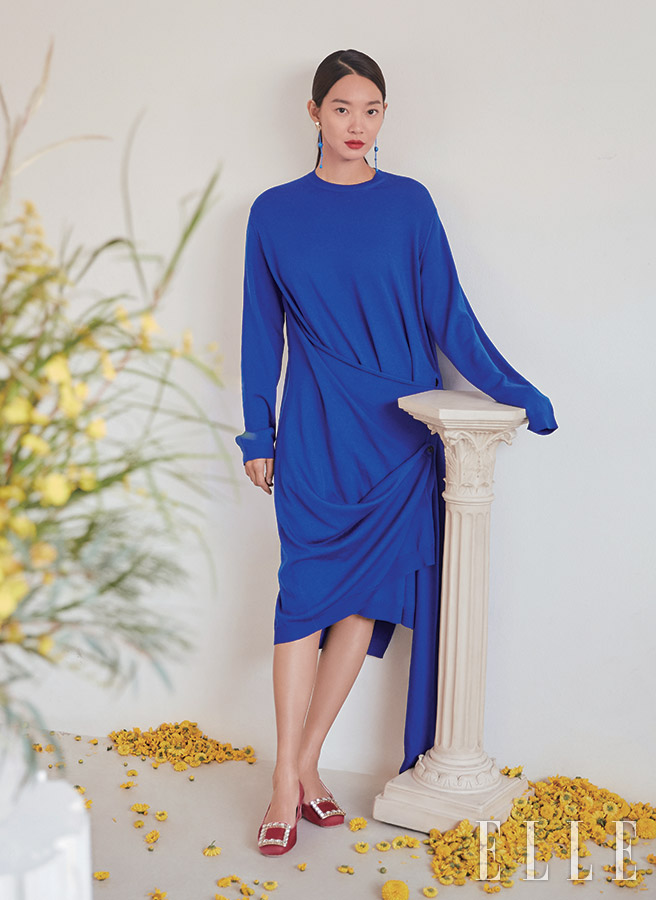 볼드한 스트라스 버클과 벨벳 소재가 믹스된 펌프스는 Roger Vivier. 니트 소재의 롱 드레스는 Ports 1961. 귀고리는 Hestia.