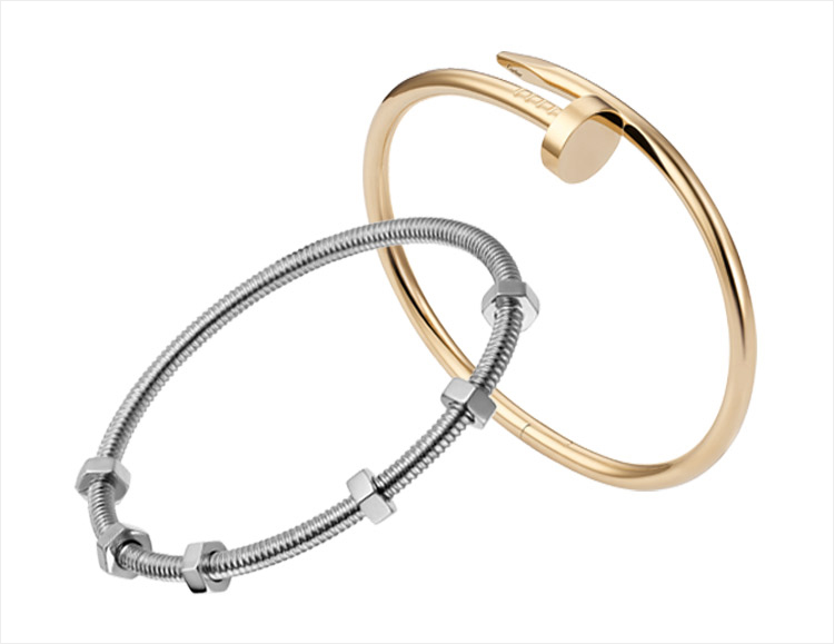 일상적 소재에 예술적 터치가 더해져 주얼리로 변신하면, 평범함은 고귀함으로 변모한다. 저스트 앵 끌루 브레이슬릿은 1970년대 알도 치풀로에 의해 까르띠에 뉴욕에서 선보인 오리지널 모델을 재현한 것으로, 못을 주얼리의 테마로 삼은 그의 과감한 시도에는 당시 반 순응주의적 사회 분위기가 반영됐다. 이 대담한 정신을 이어받아 2017년, 볼트와 너트에서 영감을 받은 에크루 드 까르띠에 브레이슬릿이 탄생했다. 못, 볼트, 너트 모두 사물을 ‘고정’할 때 쓰이는 오브제로, 시크한 에너지를 발산하는 개성있는 연인의 사랑 역시 ‘고정’하겠다는 의미. 리드미컬한 곡선과 대범함이 테마인 이 두 컬렉션은 독특한 개성을 추구하고, 있는 그대로의 자신을 표현하고 싶은 이들에게 제격이다.