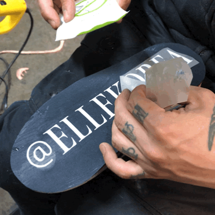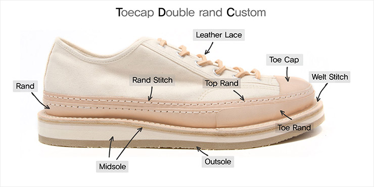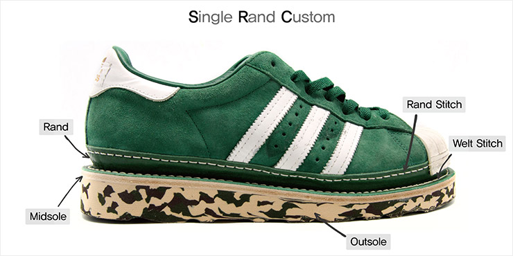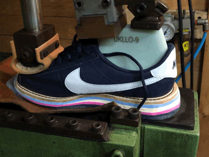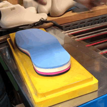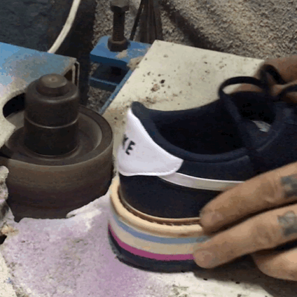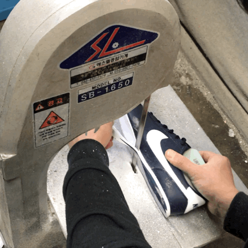 5. 아웃솔은 접착제를 바르고 말린 뒤, 열과 압력을 이용해 강력하게 접착된다. 바닥 솔 부분에 레터링서비스도 가능하다.