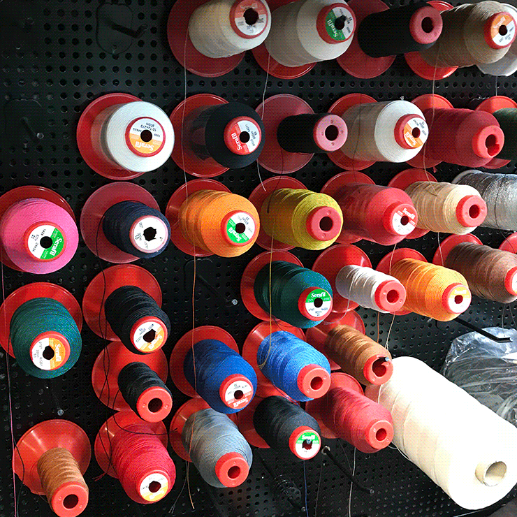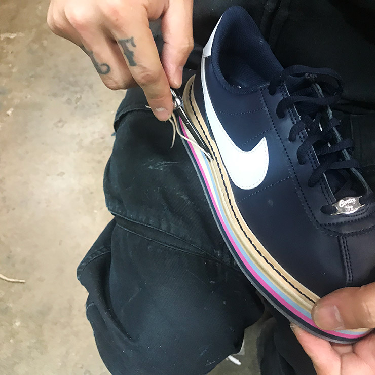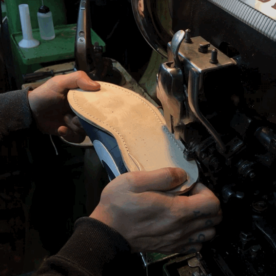 4. 미드솔과 본체를 바느질한다. 바깥 쪽과 안 쪽을 두번 봉제하며, 내구성을 강화한다.