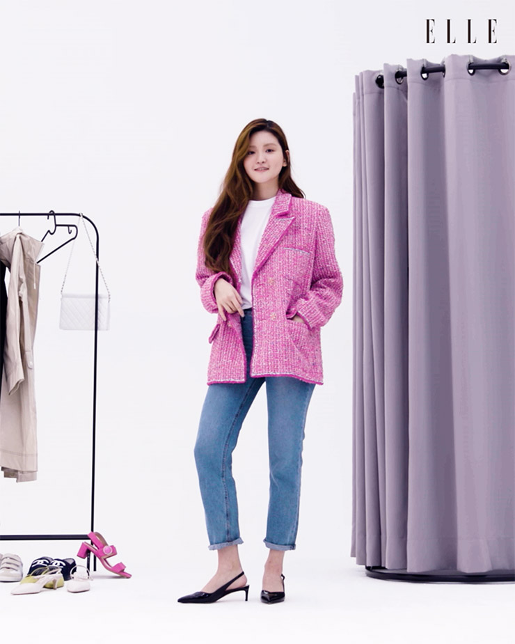 화이트 티셔츠는 Recto. 데님은 Calvin Klein Jeans. 블랙 슈즈는 Stuart Weitzman. 트위드 재킷은 Chanel.