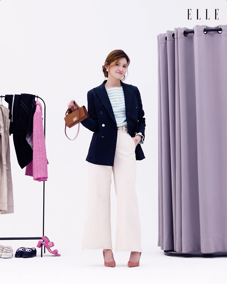 처음 입어본 블레이저는 Recto. 골드 버튼 블레이저는 Loro Piana. 골드 이어링은 Cos. 브라운 백은 Salvatora Ferragamo. 핑크 스웨이드 스틸레토는 Stuart Weitzman.