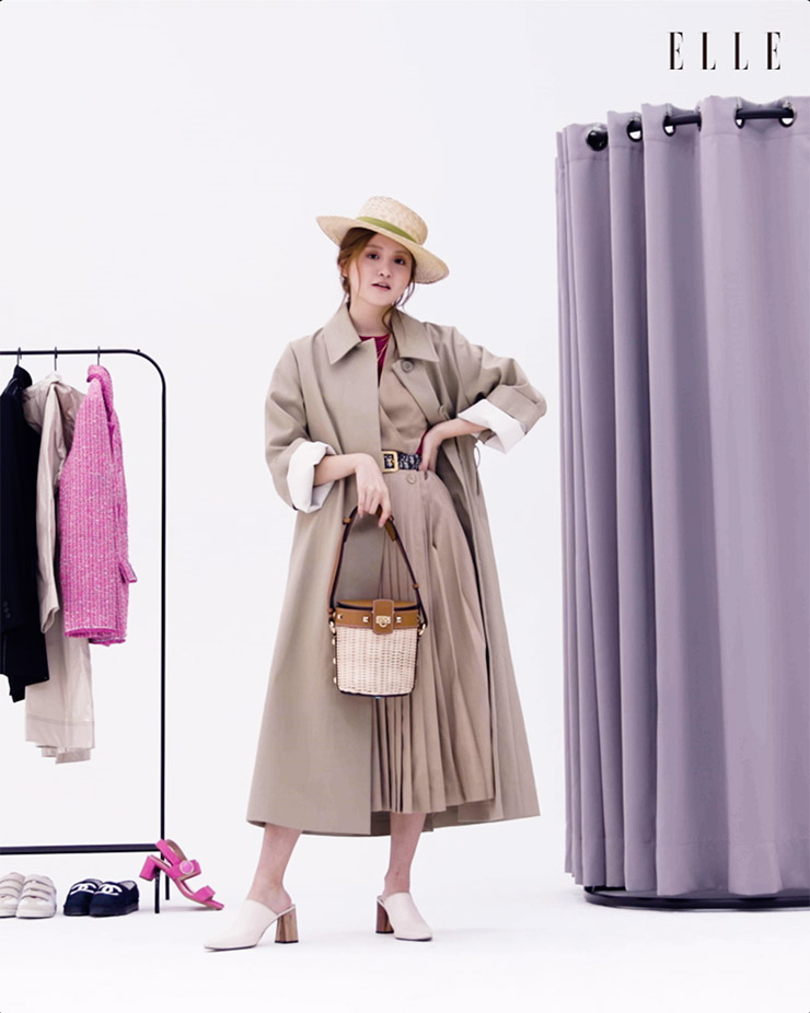 아이보리 슈즈는 Rachel Cox. 네크리스는 S by S.I.L. 스트로 햇은 High Cheeks. 트렌치코트는 Cos. 백은 Salvatore Ferragamo.