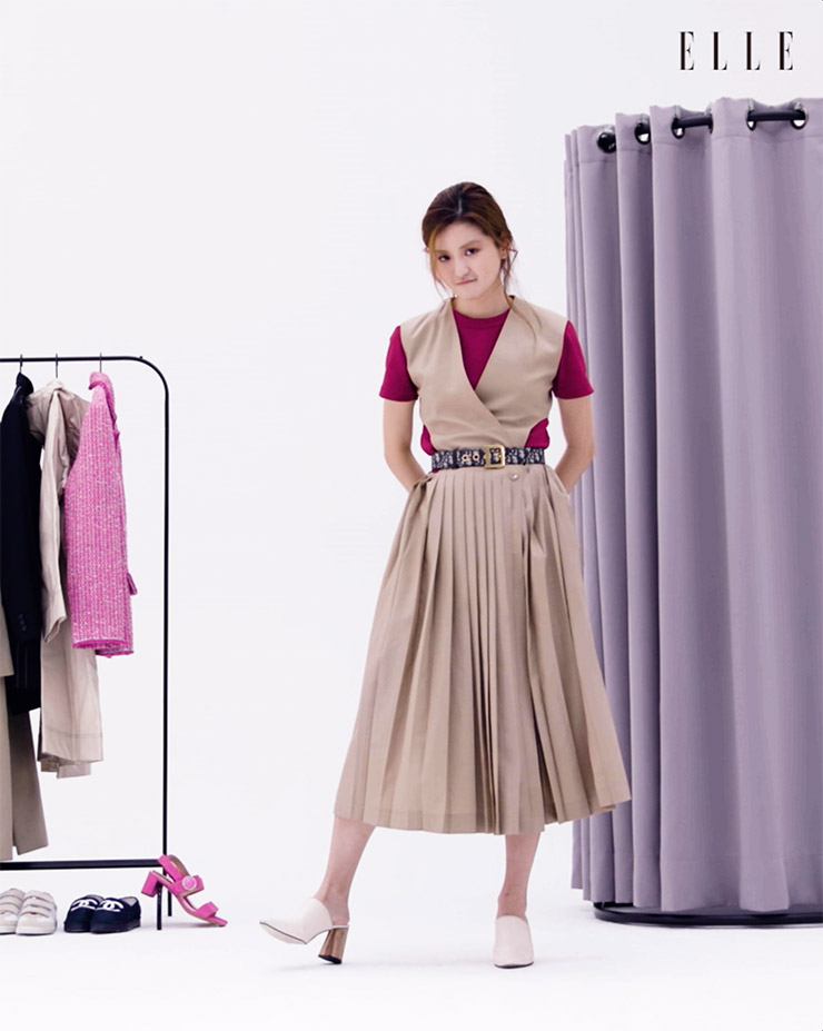 티셔츠는 Uniqlo. 베이지 플리츠 드레스는 Lowclassic. 로고 벨트는 Christian Dior. 슈즈는 Rachel Cox.