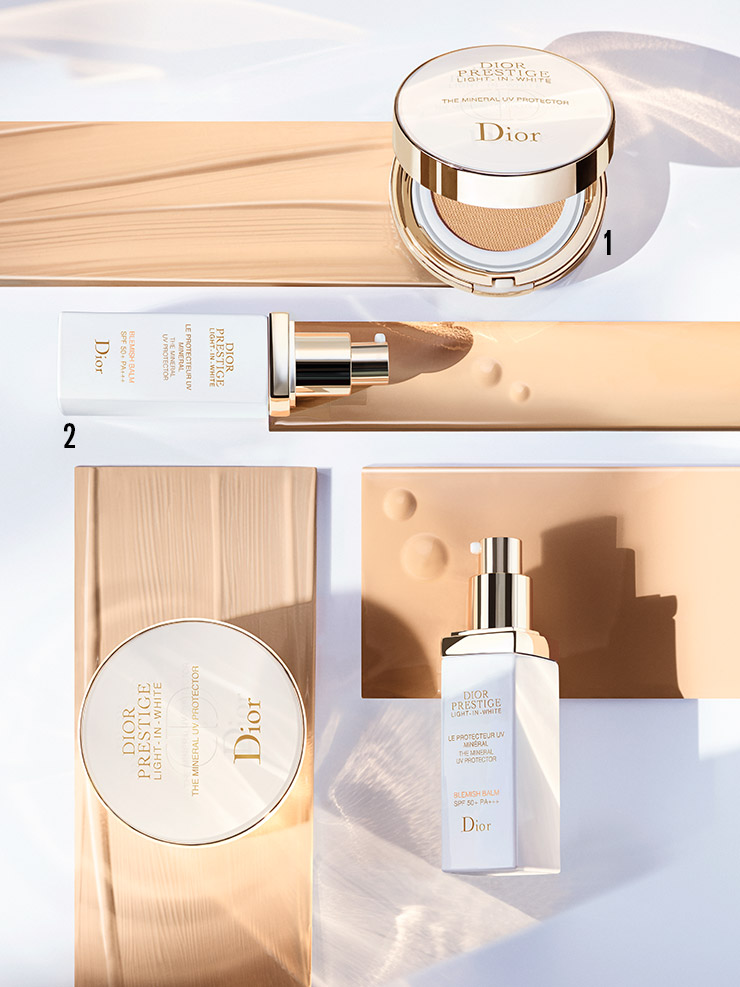 2 자외선으로부터 피부를 보호해 주는 100% 미네랄 필터. 즉각적으로 피부를 보정해 주는 디올 프레스티지 라이트-인-화이트 르 프로텍트 UV 미네랄 블레미쉬 밤(리퀴드 타입) SPF 50+/PA+++, 14만8천원대, 모두 Dior.