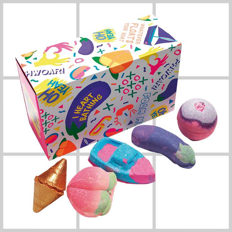 복숭아와 가지, 러브 보트 등 달콤한 향과 귀를 간지럽히는 소리가 가득한 배스 밤 세트. 아이 하트 배씽, 8만원, Lush.