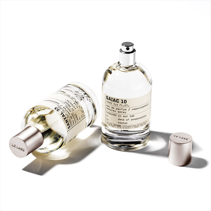 센슈얼한 우드 향이 매력적인 상탈 33, 100ml 35만5천원, 잔잔한 우디 머스크 계열의 가이악 10, 100ml 60만원, Le Labo.