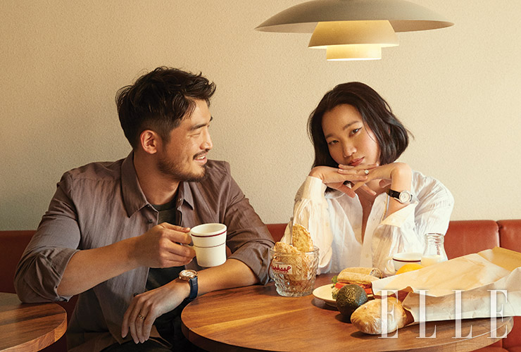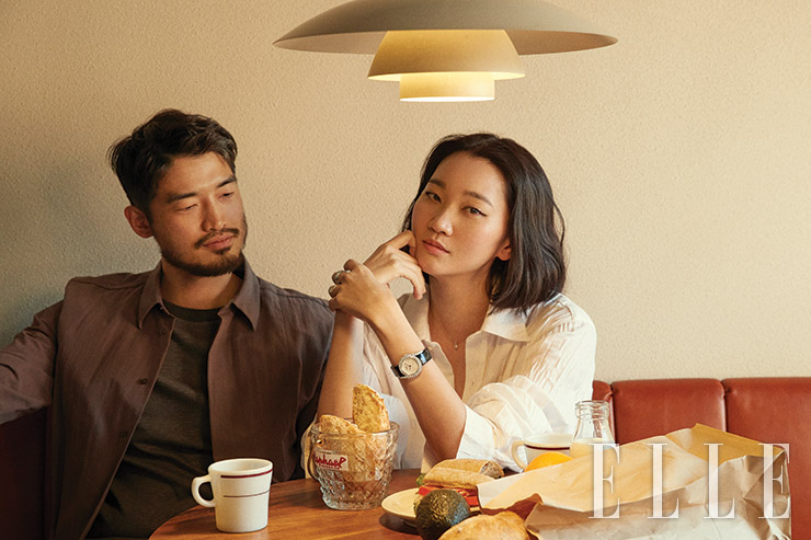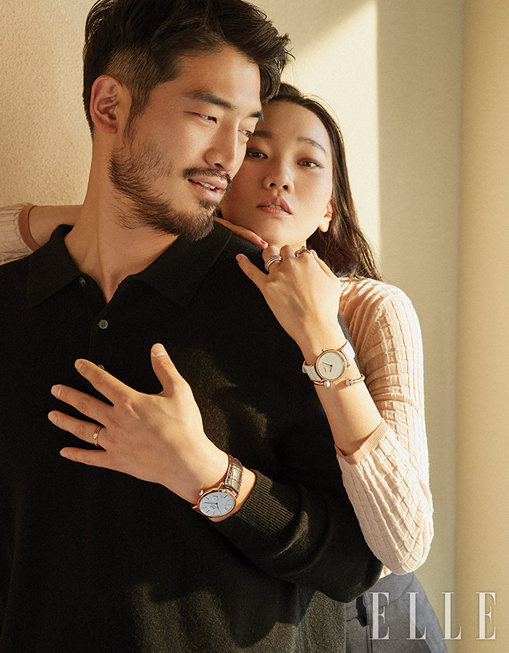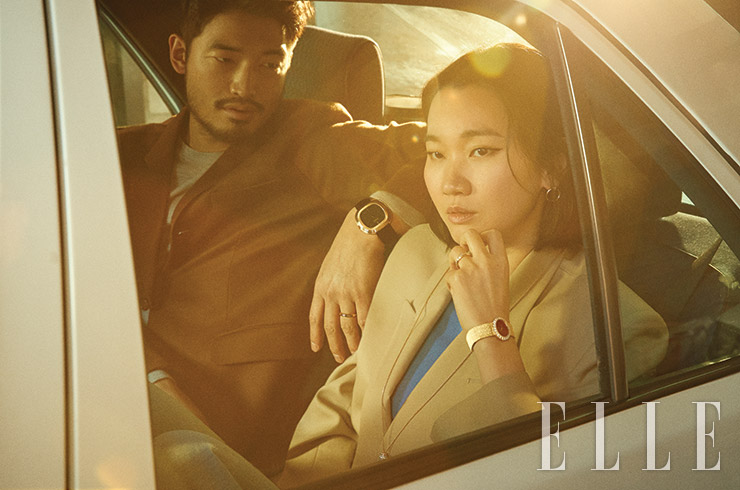 (정승민) 미니멀한 디자인이 어디든 잘 어울리는 포제션 웨딩 링, 핑크골드 베젤의 다이아몬드 장식이 돋보이는 피아제 폴로 워치는 모두 Piaget. 오버핏 셔츠는 COS. 안에 입은 스트라이프 톱은 Hugo Boss.