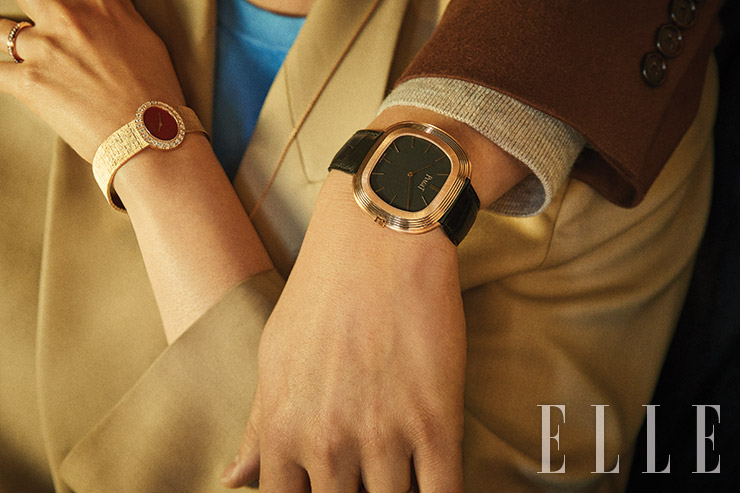 카닐리언 다이얼의 익스트림리 레이디 재키 워치, 18K 핑크골드 케이스의 앤디 워홀 워치는 모두 Piaget.