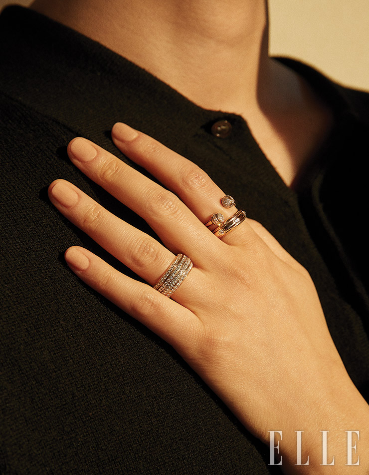 (장윤주) 약지의 포제션 링과 검지에 레이어드한 포제션 오픈 링과 포제션 링, 오팔 다이얼의 알티플라노 워치, 오픈 뱅글은 모두 Piaget. 텍스처가 독특한 니트 카디건은 Zara. 하이웨이스트 팬츠는 Kindersalmon.