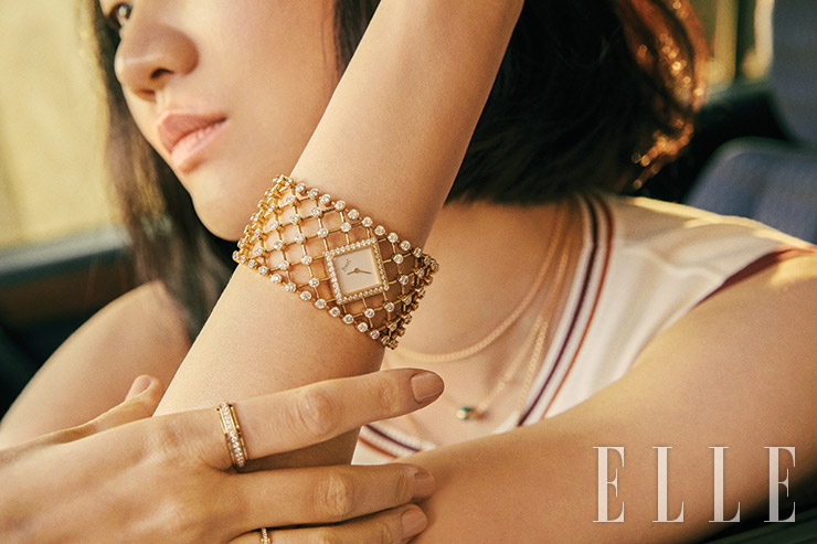 (장윤주) 핑크골드에 브릴리언트 컷 다이아몬드가 더해진 포제션 이어링, 약지의 포제션 링, 익스트림리 레이디 재키 워치, 볼로 타이를 닮은 포제션 스카이 펜던트 네크리스는 모두 Piaget. 구조적인 재킷은 Low Classic. 니트 톱은 스타일리스트 소장품.