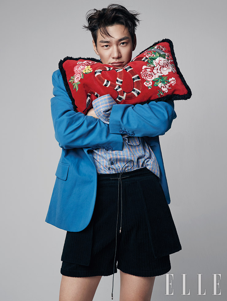 오버사이즈 재킷은 Pushbutton. 스트라이프 셔츠는 Gucci. 블랙 코듀로이 쇼츠는 Sewing Boundaries. 플라워 패턴의 쿠션은 Gucci Deco.