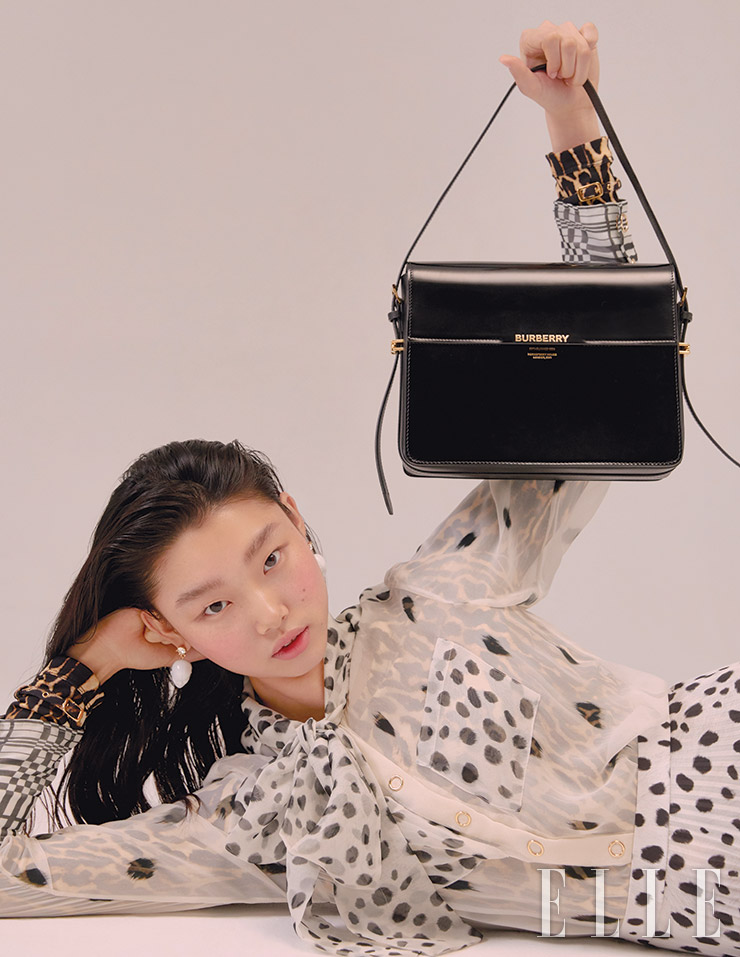 라지 사이즈의 블랙 그레이스 백과 레오퍼드 패턴의 보 디테일 실크 블라우스, 플리츠 스커트, 레오퍼드 프린트의 캐멀 컬러 이너 드레스, 화이트 드롭 장식의 브라스 이어링은 가격 미정, 모두 Burberry.