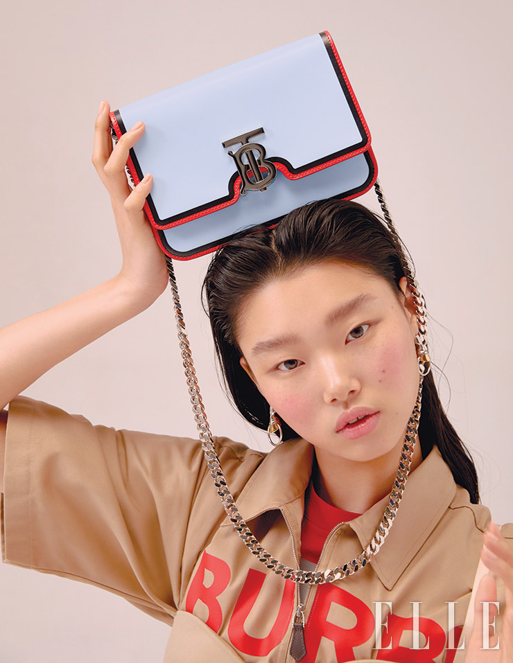 페일 블루 컬러의 레드 에지 스몰 TB 백, 코르셋과 강렬한 로고 레터링 장식의 밀리터리 코튼 셔츠, 이너로 입은 코튼 티셔츠, 브라스 이어링은 가격 미정, 모두 Burberry.