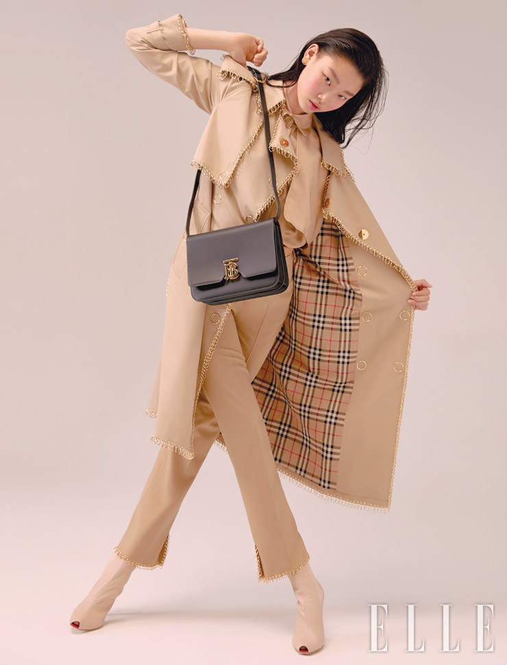 미디엄 사이즈의 블랙 TB 백, 피어싱 디테일의 트렌치코트와 울 팬츠, 링 스냅 실크 셔츠, 언밸로프 포켓 가죽 벨트, TB 모노그램 이어링과 오픈 토 앵클부츠는 가격 미정, 모두 Burberry.