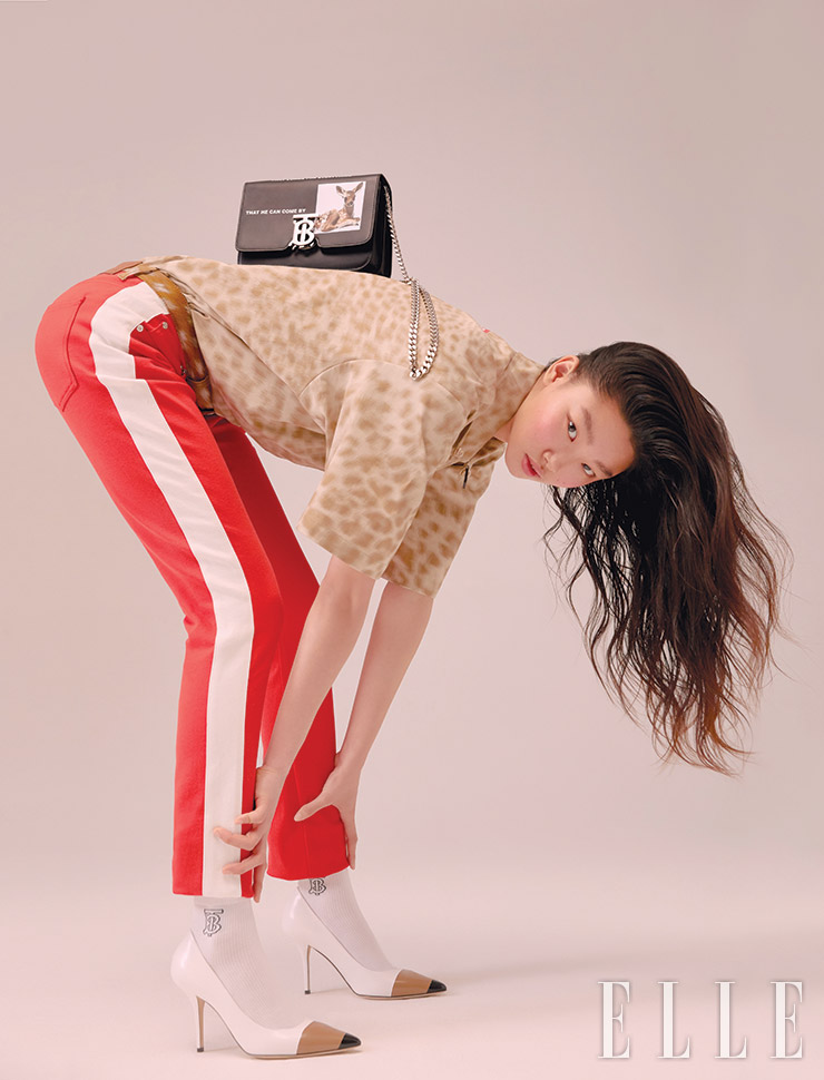 사슴 몽타주 프린트의 스몰 TB 백, 사슴 패턴의 밀리터리 셔츠, 화이트 라이닝 포인트의 레드 코튼 팬츠, 로고 삭스와 테이프 디테일의 펌프스는 가격 미정, 모두 Burberry.