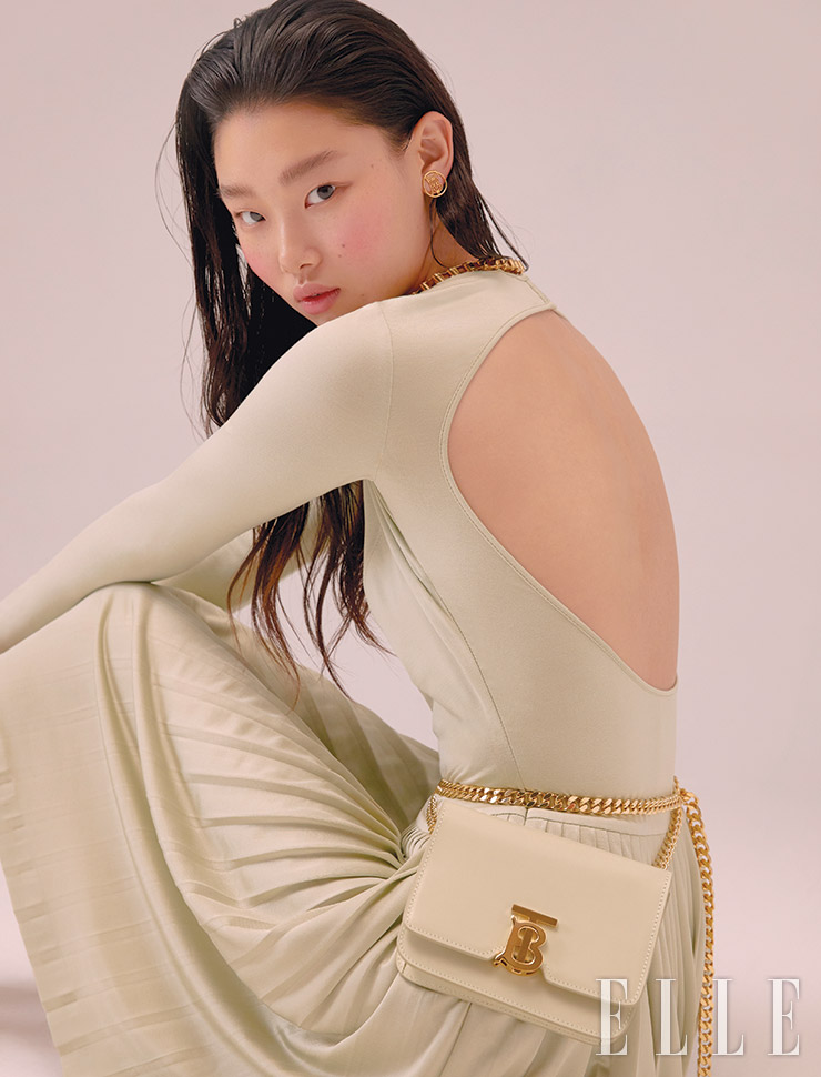 페일 세이지 컬러의 체인 스트랩 벨트 TB 백, 백라인의 컷오프 디테일이 매력적인 플리츠 드레스, TB 모노그램 이어링은 가격 미정, 모두 Burberry.
